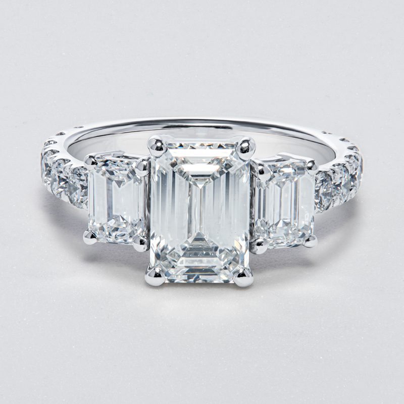 A stunning 2.21 ct. lab-grown diamond ring features a G color, VS1 clarity emerald-cut stone set on 14K white gold. Two 0.50 ct. matching lab-grown emerald-cut diamonds complement the centerpiece, while a ¾ wrap of 2.5mm round lab-grown matching diamonds adds to the setting’s allure.